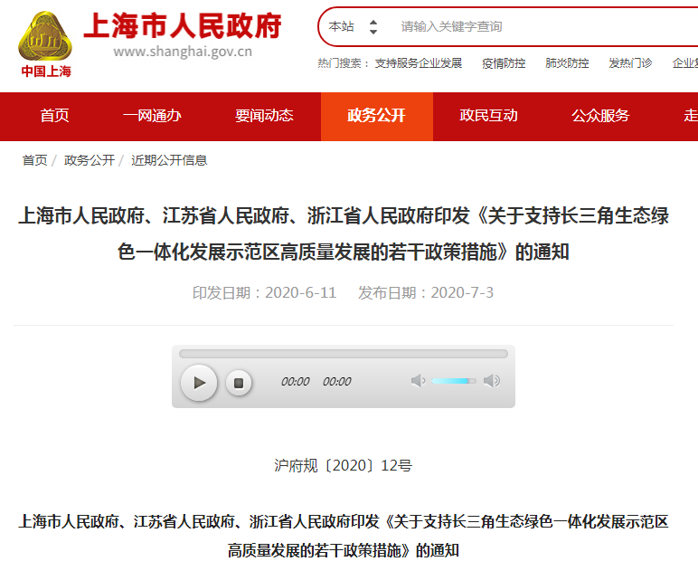 近日,上海市人民政府发布:上海市人民政府、江苏省人民政府、浙江省人民政府印发《关于支持长三角生态绿色一体化发展示范区高质量发展的若干政策措施》的通知。
