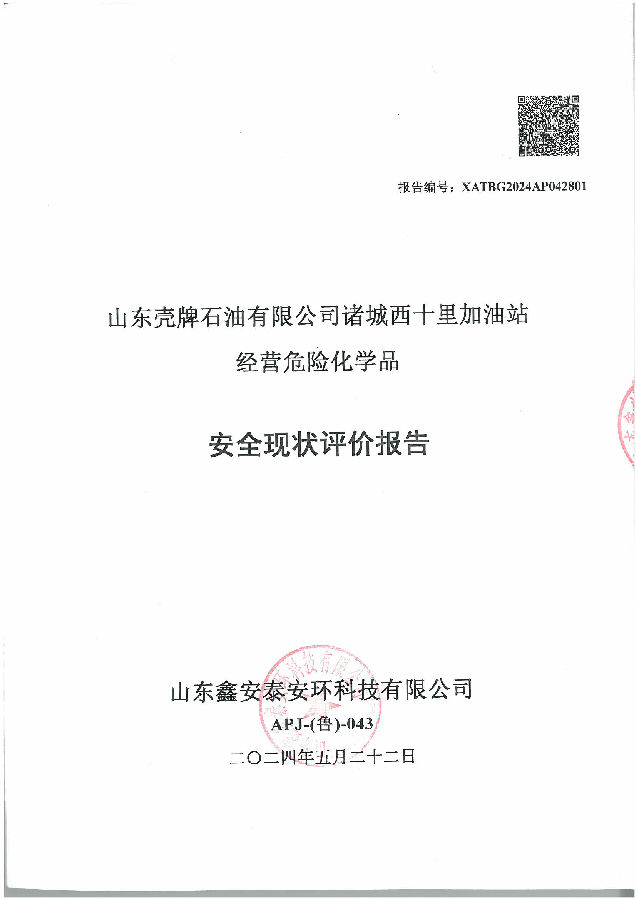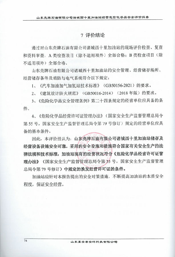 评价结论: 山东壳牌石油有限公司诸城西十里加油站符合危险化学品经营单位的安全要求。 | |||