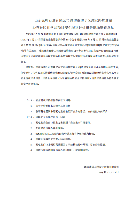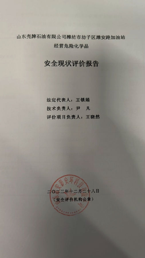 项目名称 | 山东壳牌石油有限公司潍坊市坊子区潍安路加油站经营危险化学品安全现状评价 | ||