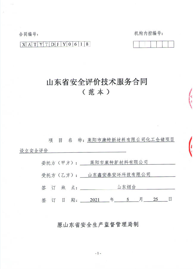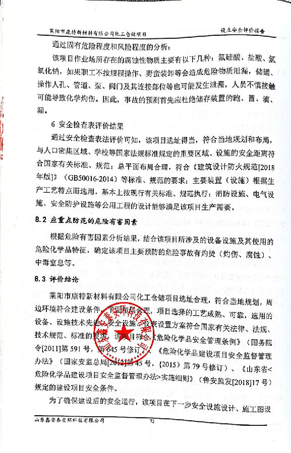 项目单位:莱阳市康特新材料有限公司 注册地址:山东省烟台市莱阳市旌旗西路270号 法人代表:周永成 注册资本:伍拾万元整 经营范围:第3类(不含成品油)、第4类、第5类、第6.1类、第8类危险化学品(以上各类均不含剧毒、监控化学品,易制毒化学品,易制爆化学品)批发(禁止储存)(有效期至2016年4月29日)。(有效期以许可证为准)。化工原料及助剂分装、销售(以上不含危险品),建筑材料、钢材、木材、化学试剂、五金交电、日用百货、玻璃仪器的批发、零售(以上范围法律法规禁止的除外,需许可或审批经营的,须凭许可证或审批的文件经营)。(依法须经批准的项目,经相关部门批准后方可开展经营活动)。 项目投资:3476万元 项目简介:莱阳市康特新材料有限公司在山东省烟台市莱阳市海河路西、莱山路南投资3476万元建设化工仓储项目,该项目属于新建危险化学品储存项目,目前仅设有一座原有场地的传达室,其余目前均为规划空地。该项目占地面积15746m2,总建筑面积6119m2,包括1#车间、办公楼、传达室,同时新购置储罐及其配套设备,项目建成后储罐仓储能力3470m3,年可周转化工原料57000m3。 | |||