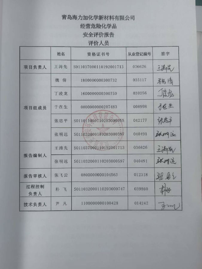 项目名称 | 青岛海力加化学新材料有限公司经营危险化学品安全评价报告 | ||