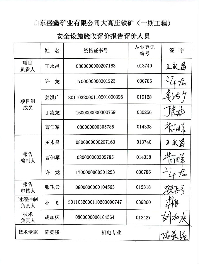 项目负责人 | 王永昌 | 评价类型 | 安全设施验收评价 |