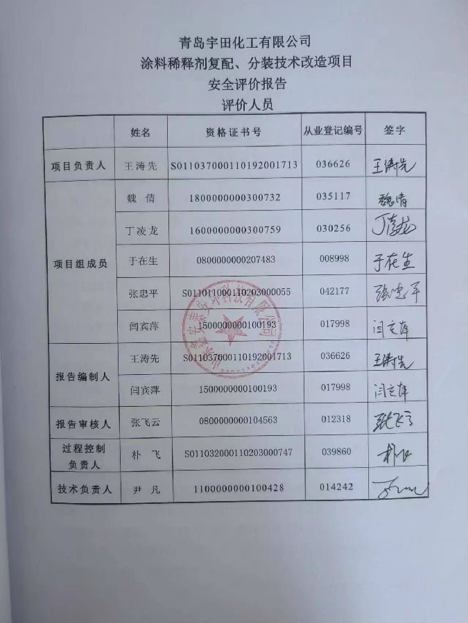 项目名称 | 青岛宇田化工有限公司涂料稀释剂复配、分装技术改造项目安全评价报告 | ||