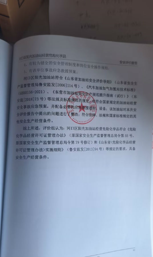 项目单位:河口区阳光加油站 该加油站于2019年10月23日取得了东营市应急管理局批复的加油站《危险化学品经营许可证》(编号为:鲁东危化经〔2019〕050296号)有效期至2022年10月22日,经营范围为汽油、柴油[闭杯闪点≤60℃](汽油储罐3×25m3,柴油储罐1×25m3);该站于2020年4月10日取得了东营市商务局批复的《成品油零售经营批准证书》(编号:鲁油零售证书第3705021005号)有效期至2025年4月10日。 | |||