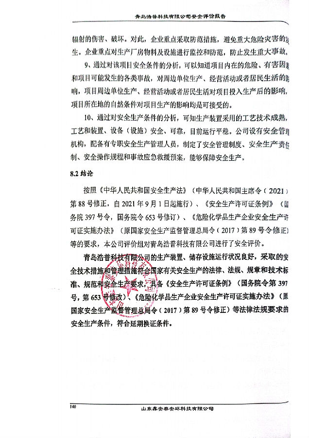 项目单位:青岛浩普科技有限公司 注册地址:青岛平度市新河生态化工科技产业基地萃水路6号 经营范围:许可项目:危险化学品生产;危险化学品经营;货物进出口;各类工程建设活动。(依法须经批准的项目,经相关部门批准后方可开展经营活动,具体经营项目以相关部门批准文件或许可证件为准)一般项目:专用化学产品制造(不含危险化学品);专用化学产品销售(不含危险化学品);化工产品生产(不含许可类化工产品);化工产品销售(不含许可类化工产品);生物化工产品技术研发;技术服务、技术开发、技术咨询、技术交流、技术转让、技术推广;日用化工专用设备制造;通用设备制造(不含特种设备制造);日用品生产专用设备制造;塑料包装箱及容器制造;住房租赁。(除依法须经批准的项目外,凭营业执照依法自主开展经营活动)。 项目投资:安全现状报告,非新、改、扩建设项目。 项目简介:青岛浩普科技有限公司取得了山东省应急管理厅换发的安全生产许可证,编号:(鲁)WH安许证字[2022]020298号,有效期至2023年9月11日。许可范围:过氧乙酸[含量≦16%,含水≧39%,含有稳定剂]1000吨/年。 青岛浩普科技有限公司根据《安全生产许可证条例》(国务院397号令,国务院令653号修订)、《危险化学品生产企业安全生产许可证实施办法》(原安监总局令第41号颁发,第79号修订、第89号修订)等文件的相关要求,申请《安全生产许可证》延期换证。 | |||