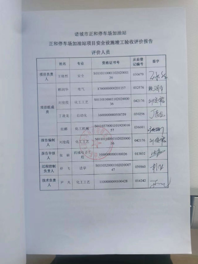项目单位:诸城市正和停车场加油站 法人代表:张金水 | |||