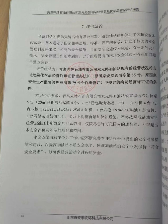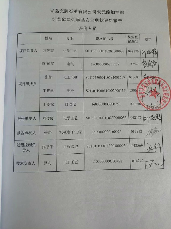 项目名称 | 青岛壳牌石油有限公司双元路加油站经营危险化学品安全评价 | ||