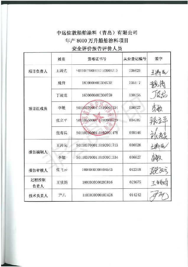 项目名称 | 中远佐敦船舶涂料(青岛)有限公司年产8000万升船舶涂料项目安全评价报告 | ||