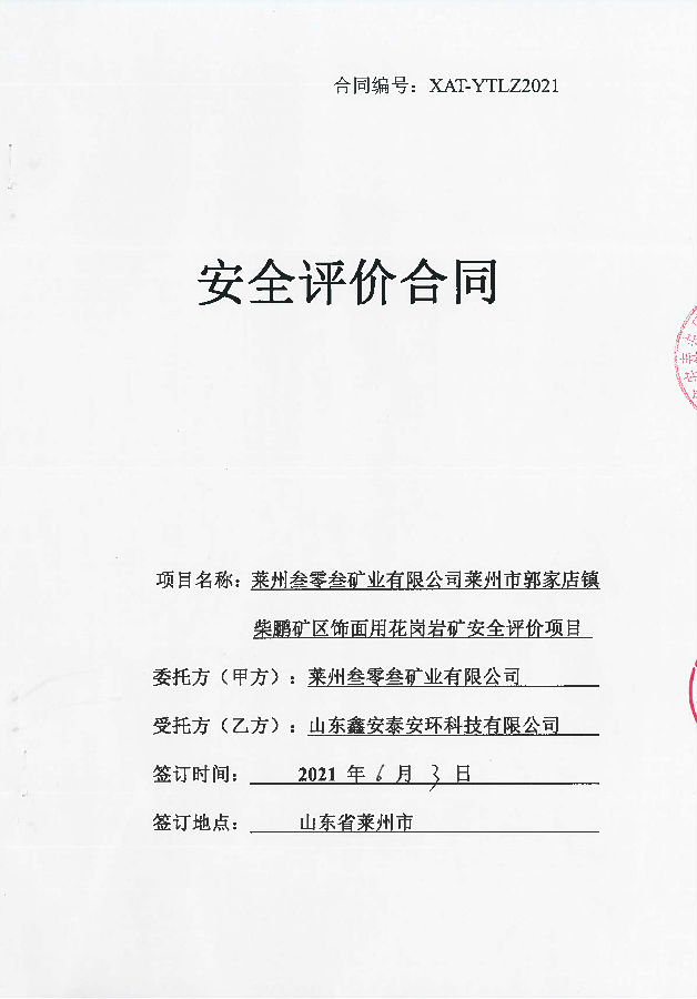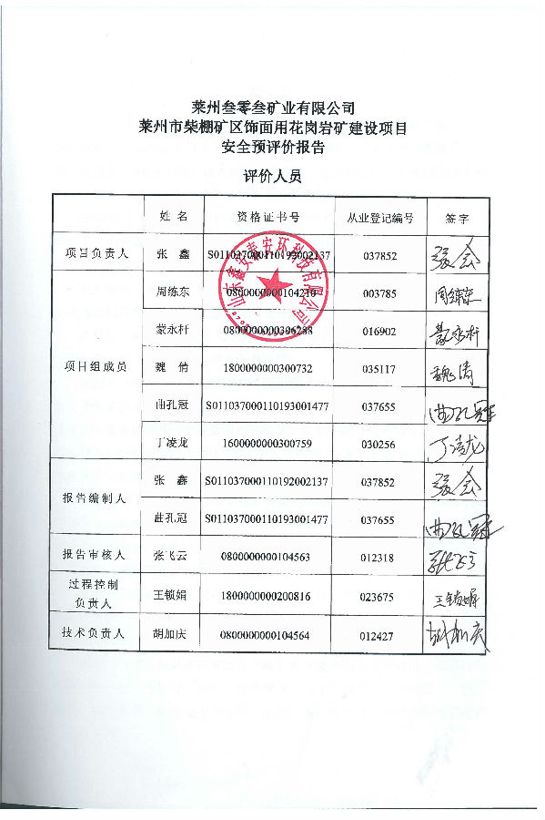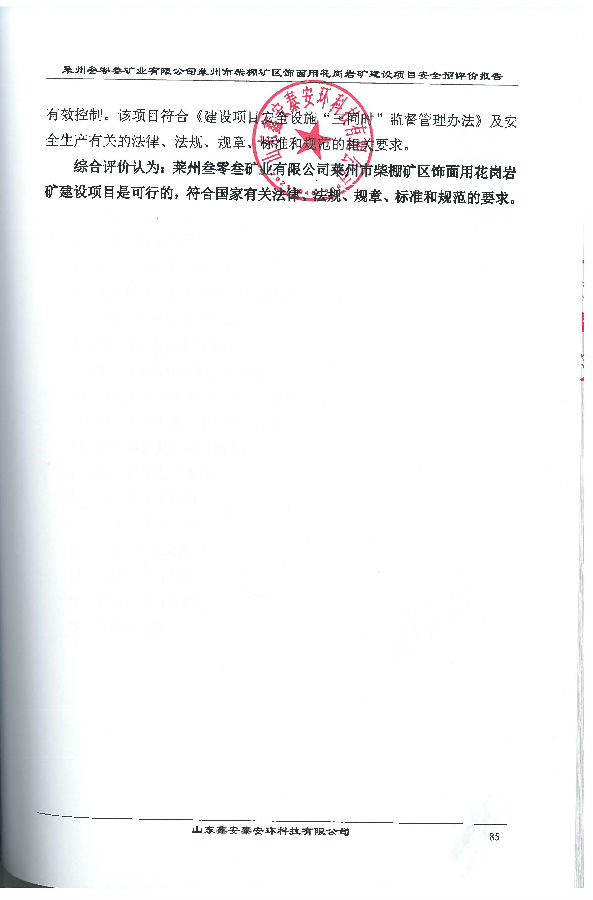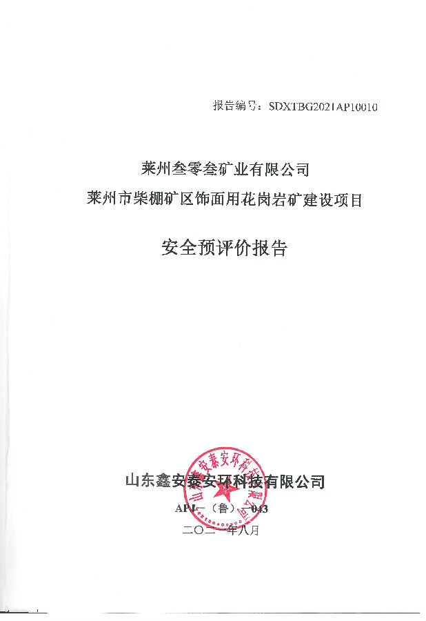 项目名称 | 莱州叁零叁矿业有限公司莱州市柴棚矿区饰面用花岗岩矿建设项目安全预评价报告 | ||