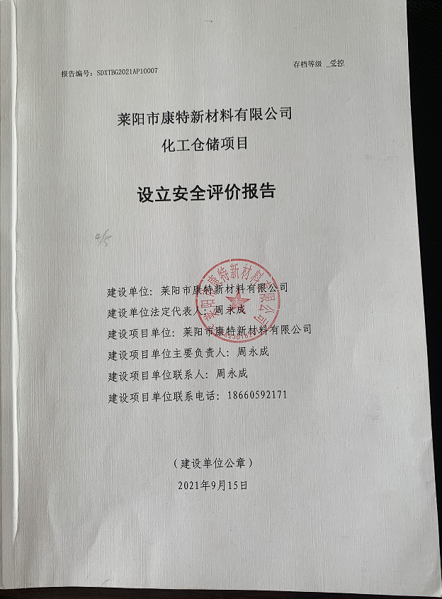 项目单位:莱阳市康特新材料有限公司 注册地址:山东省烟台市莱阳市旌旗西路270号 法人代表:周永成 注册资本:伍拾万元整 经营范围:第3类(不含成品油)、第4类、第5类、第6.1类、第8类危险化学品(以上各类均不含剧毒、监控化学品,易制毒化学品,易制爆化学品)批发(禁止储存)(有效期至2016年4月29日)。(有效期以许可证为准)。化工原料及助剂分装、销售(以上不含危险品),建筑材料、钢材、木材、化学试剂、五金交电、日用百货、玻璃仪器的批发、零售(以上范围法律法规禁止的除外,需许可或审批经营的,须凭许可证或审批的文件经营)。(依法须经批准的项目,经相关部门批准后方可开展经营活动)。 项目投资:3476万元 项目简介:莱阳市康特新材料有限公司在山东省烟台市莱阳市海河路西、莱山路南投资3476万元建设化工仓储项目,该项目属于新建危险化学品储存项目,目前仅设有一座原有场地的传达室,其余目前均为规划空地。该项目占地面积15746m2,总建筑面积6119m2,包括1#车间、办公楼、传达室,同时新购置储罐及其配套设备,项目建成后储罐仓储能力3470m3,年可周转化工原料57000m3。 | |||