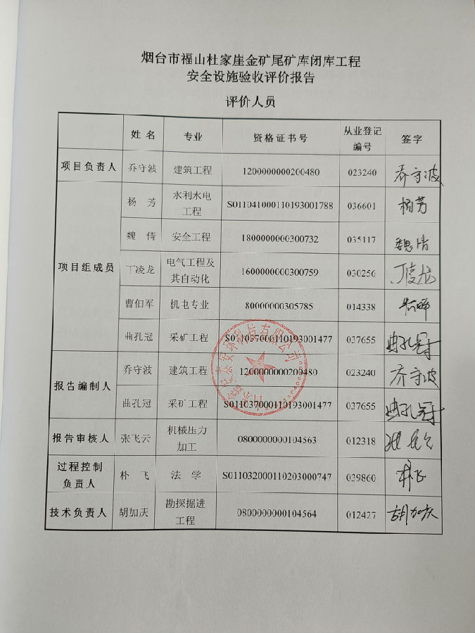 烟台市福山杜家崖金矿尾矿库闭库工程安全设施验收评价