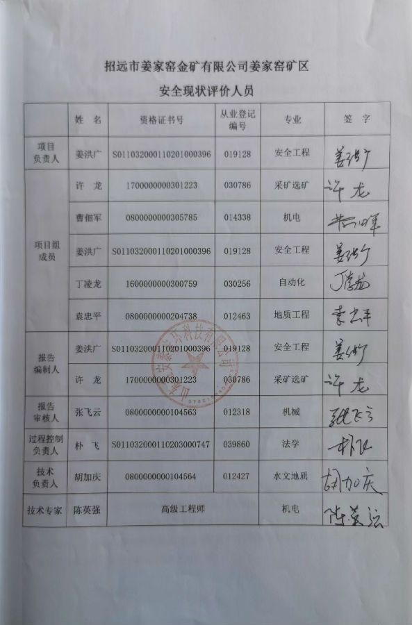 项目名称 | 招远市姜家窑金矿有限公司姜家窑矿区安全现状评价 | ||