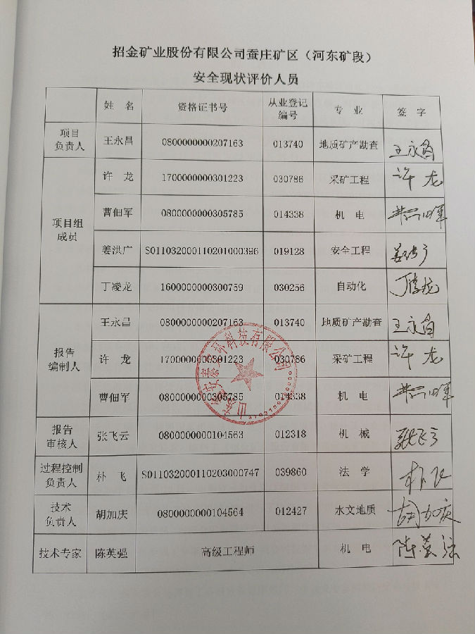 项目名称 | 招金矿业股份有限公司蚕庄矿区河东矿段安全现状评价 | ||