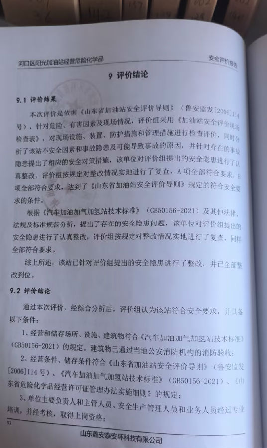 项目单位:河口区阳光加油站 该加油站于2019年10月23日取得了东营市应急管理局批复的加油站《危险化学品经营许可证》(编号为:鲁东危化经〔2019〕050296号)有效期至2022年10月22日,经营范围为汽油、柴油[闭杯闪点≤60℃](汽油储罐3×25m3,柴油储罐1×25m3);该站于2020年4月10日取得了东营市商务局批复的《成品油零售经营批准证书》(编号:鲁油零售证书第3705021005号)有效期至2025年4月10日。 | |||