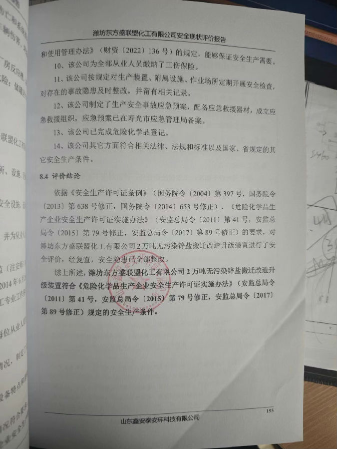项目名称 | 潍坊东方盛联盟化工有限公司2万吨无污染锌盐搬迁改造升级装置安全现状评价 | ||